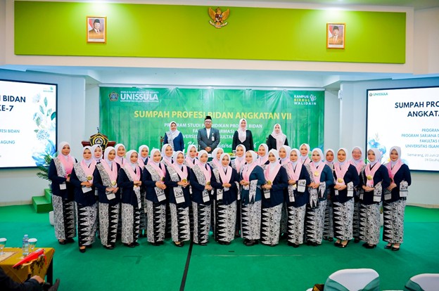 27 bidan baru Profesi Bidan Fakultas Farmasi Unissula mengikuti sumpah profesi bidan ke-VII. Total lulusan profesi bidan adalah 158 bidan yang tersebar di tingkat nasional dan internasional. Digelar di Aula Gedung Kuliah Bersama Lantai 10 Kampus Unissula, hadir Wakil Rektor I Unissula Andre Sugiyono ST MM PhD, Wakil Ketua I Pengurus Daerah Ikatan Bidan Indonesia (IBI) Provinsi Jawa Tengah Dr Tri Susilowati MKes, dan Dekan Fakultas Farmasi Dr Apt Rina Wijayanti MSc, Kamis (26/6/2025).