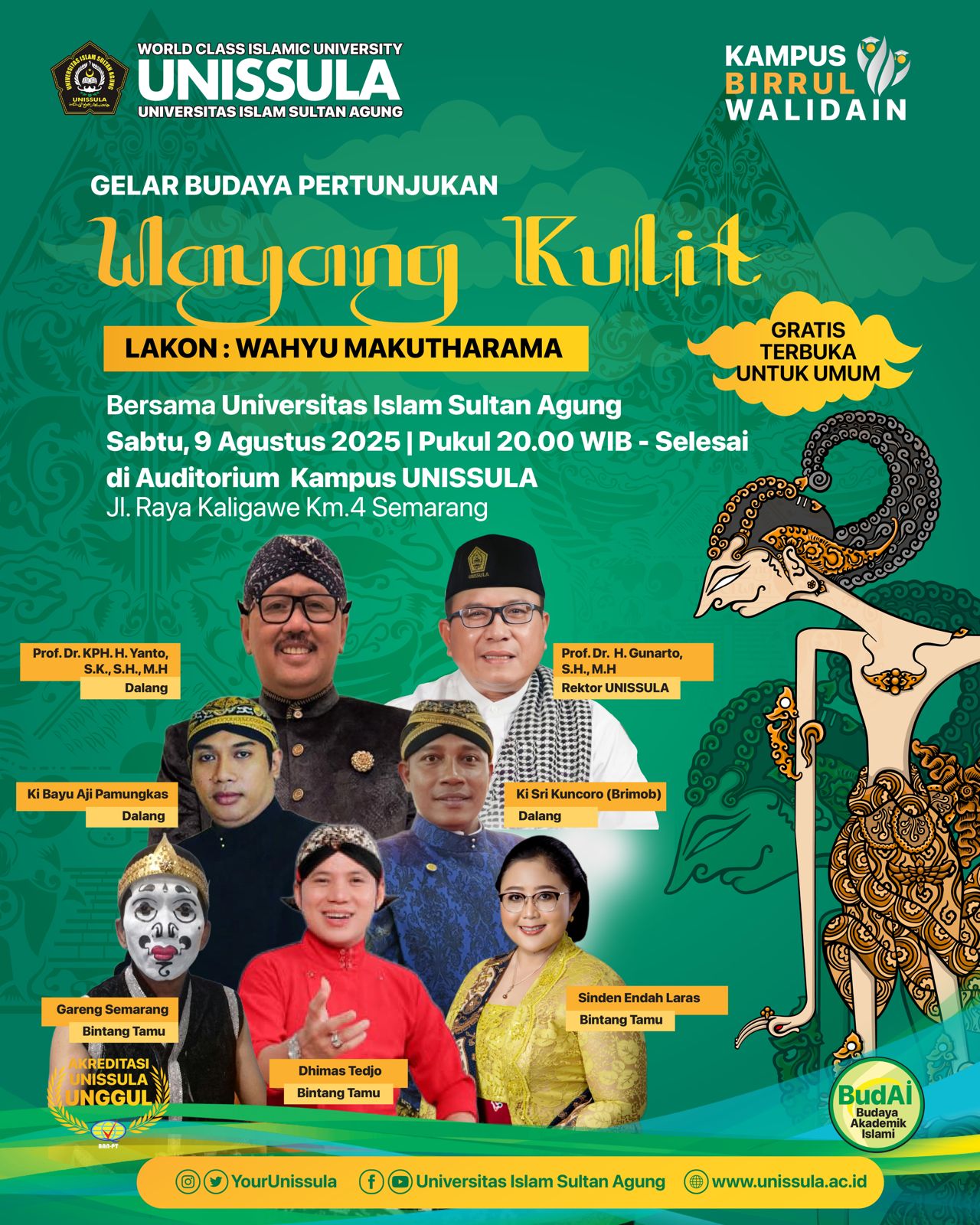 Unissula akan menggelar pementasan wayang kulit pada Sabtu malam Ahad (9/8/2025) dan terbuka untuk masyarakat umum. Pentas dihelat di Auditorium kampus Unissula jalan Kaligawe KM 4 Semarang mulai pukul 19.30. Lakon yang yang dipentaskan yaitu Wahyu Makutharama. Adapun dalangnya adalah Ki Bayu Aji Pamungkas, Prof Dr KPH Yanto dan Ki Sri Kuncoro. Para bintang tamu yang hadir antara lain Sinden Endah Laras, Dhimas Tedjo, dan Gareng Semarang.