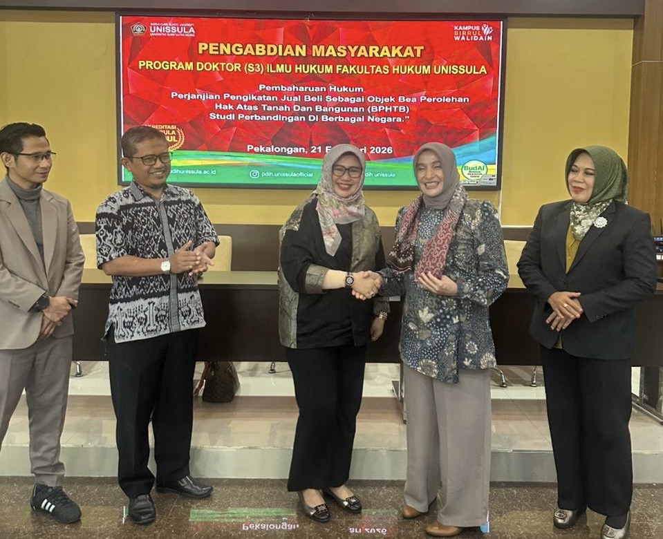 Program Doktor Ilmu Hukum (PDIH) Unissula menggelar kegiatan pengabdian masyarakat di lingkungan Pemerintah Kota Pekalongan, Sabtu (21/2/2026). Mengangkat tema “Pembaharuan Hukum Perjanjian Pengikatan Jual Beli sebagai Objek Bea Perolehan Hak atas Tanah dan Bangunan (BPHTB): Studi Perbandingan di Berbagai Negara”, kegiatan ini menghadirkan unsur legislatif, eksekutif, akademisi, notaris, serta mahasiswa internasional.