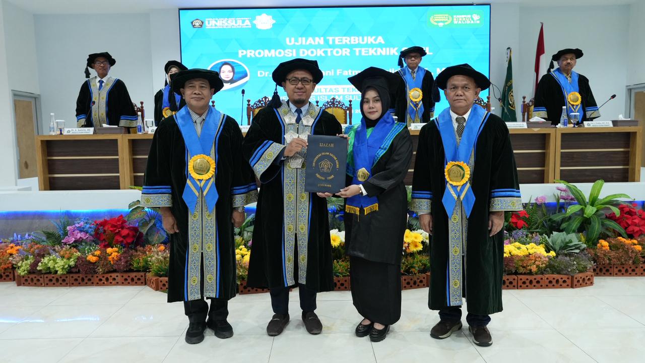 Nur Fithriani Fatma Cholida ST MT berhasil meraih gelar doktor.  Ia lulus dalam ujian terbuka doktor di Program Doktor Teknik Sipil (PDTS) Unissula, pada Sabtu (25/4/2026).