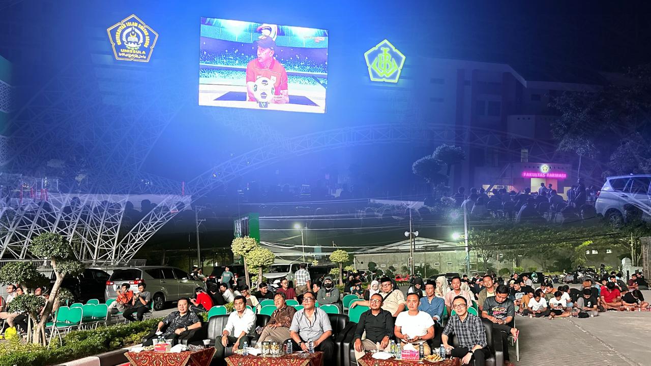 Dosen, karyawan, mahasiswa Unissula dan pengurus Yayasan Badan Wakaf Sultan Agung (YBWSA) mengadakan nonton bareng (nobar) pertandingan sepak bola antara Timnas Indonesia melawan Timnas China. Mereka menonton lewat videotron yang berada di samping gedung Rektorat pada Kamis malam Jum’at (5/6/2025).